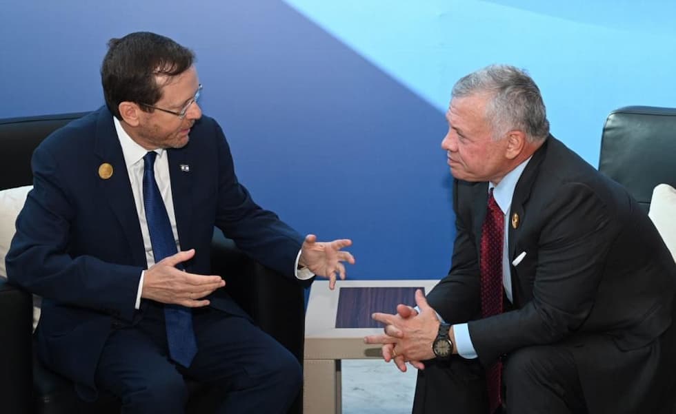 נשיא המדינה יצחק הרצוג נפגש כעת עם מלך ירדן, עבדאללה השני, בועידת האקלים COP27 בשארם א- שייח׳ שבמצרים. בפגישתם דנו בין היתר בשיתוף הפעולה המשולש בין ירדן, איחוד האמירויות וישראל בנושא אנרגיה ומים ובפרויקט הירדן הדרומי לשיקום נהר הירדן. כמו כן, דנו השניים בהמשך קידום היחסים בין המדינות ובנושאים אזוריים שונים.
