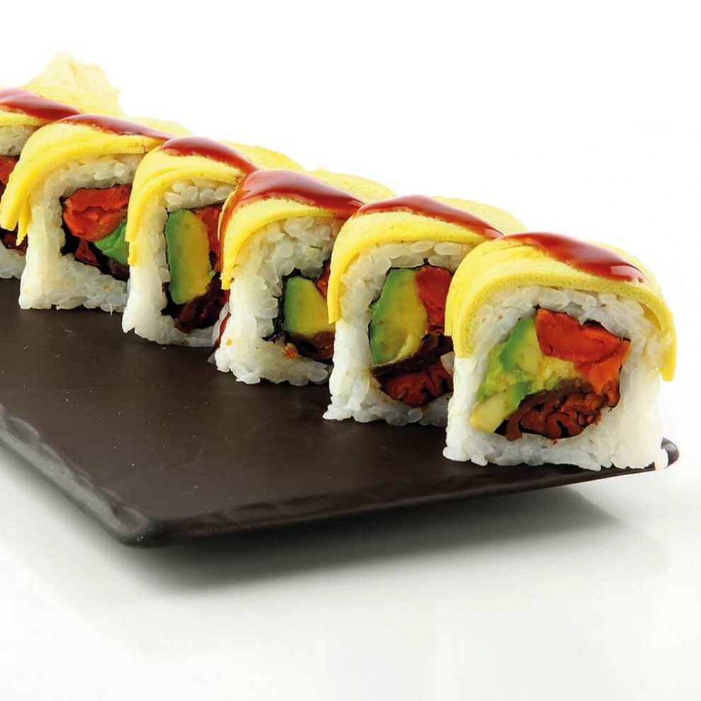 לפתוח רפידה של 120 גרם אורז סושי וחצי אצת סושי, להניח בפנים רצועות אבוקדו, רצועות מלפפון ורצועות גזר ולגלגל. לפזר מעל סומסום קלוי ולחתוך ל8- יחידות שוות.