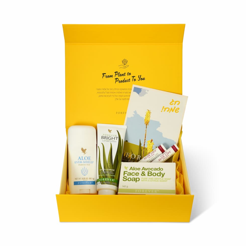 מארז FOREVER BASICS : כולל 2 שפתוני אלו ליפס, ג’ל לצחצוח השיניים, סבון אבוקדו ודיאודורנט, במחיר של 145 ₪.