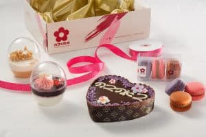 מארז לאוהבים שאוהבים מתוק כולל: עוגת לב שוקולדית בציפוי גנש שוקולד עם הכיתוב “באהבה”, זוג מוסים אישיים מוס גבינה אוכמניות – מוס גבינה עדין בציפוי של קונפיטורת אוכמניות, שילוב נהדר של חמצמצות הגבינה ופירותיות הקונפיטורה. מעוטר בפרלין וקרם שוקולד לבן עם פירות טריים ומוס ריבת חלב – שכבה של ריבת חלב משובחת עם שכבה של גנאש לבן במתיקות מאוזנת בעיטורים פרחים מהממים וגביעים של ריבת חלב וזוג כיסים של מקרונים צבעוניים (129 שקלים). משלוחים באתר.