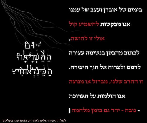 בימים של אובדן ועצב של עמנו אנו מבקשות להשמיע קול, אולי זו לחישה, לכתוב מהבטן בנשימה עצורה, לדמם ולצרוח אל תוך היצירה. זו החרב שלנו, מברזל או מנוצה.