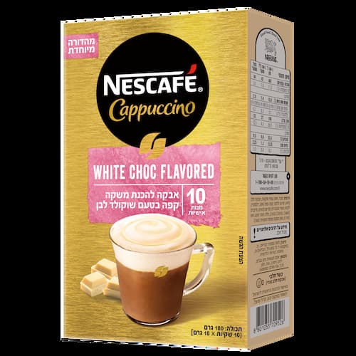 נסקפה קפוצ’ינו בטעם שוקולד לבן הוא שילוב בין תערובת חלב, קפוצ’ינו איכותי מבית נסקפה, ושכבת קצף מפנקת, שאליהם מתווספת מתיקות בטעם שוקולד לבן מענג. הוא מספק חוויה מפנקת של קפוצ’ינו בטעם שוקולד לבן, כמו בבית קפה אך פשוט להכנה – תוך שניות ספורות בלבד, ומאפשר ליהנות מרגע של פינוק בכל מקום – בבית, בטיול או במשרד.