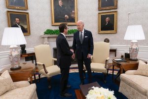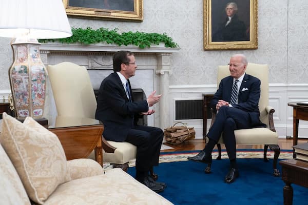 נשיא ארצות הברית, ג׳ו ביידן: ״אדוני הנשיא, ברוך שובך! ברוך שובך לוושינגטון וברוך שובך לבית הלבן. היינו יחד בישראל, ועכשיו אנחנו יחד כאן, יש לנו נושאים רבים לדון בהם, אתה יודע שאהבתי לישראל היא עמוקה וארוכת שנים, וכפי שאני אומר לעיתים קרובות אם ישראל לא הייתה קיימת היינו צריכים להמציא אותה. 75 שנים- קשה להאמין. זוהי ידידות שאני מאמין שאינה ניתנת לשבירה, ויחד אנו עובדים על יצירת אינטגרציה ויציבות במזרח התיכון. זוהי עבודה קשה, ויש עוד עבודה רבה לפנינו, אבל חלה התקדמות. שנה שעברה ארגנו את הכנס הגדול ביותר של ערבים וישראלים, שהתקיים בעשור האחרון, הקמנו את הגבול הימי בין ישראל ללבנון- דבר שאנשים חשבו שמעולם לא יקרה. פתחנו שטח אווירי לישראל מעל ערב הסעודית ועומאן, וקרבנו ישראלים ופלסטינאים בשארם א- שייח׳.
