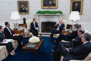 לבסוף אדוני הנשיא, אני יודע שדיברת על כך, ואנו נדון בזה גם- המצב הפנימי בישראל. כפי שאתה יודע, אני כאן ואני שמח להיות כאן, ומחר אדבר מול מושב משותף בקונגרס, שהתכנס במיוחד לחגוג את 75 שנות עצמאותה של מדינת ישראל, יחד עם זאת ליבי ומחשבותיי נמצאים בישראל, בויכוח הסוער שהוא גם מייצג את הדמוקרטיה הנפלאה שיש בישראל. תן לי להיות ברור- הדמוקרטיה בישראל חזקה, איתנה ונחושה.