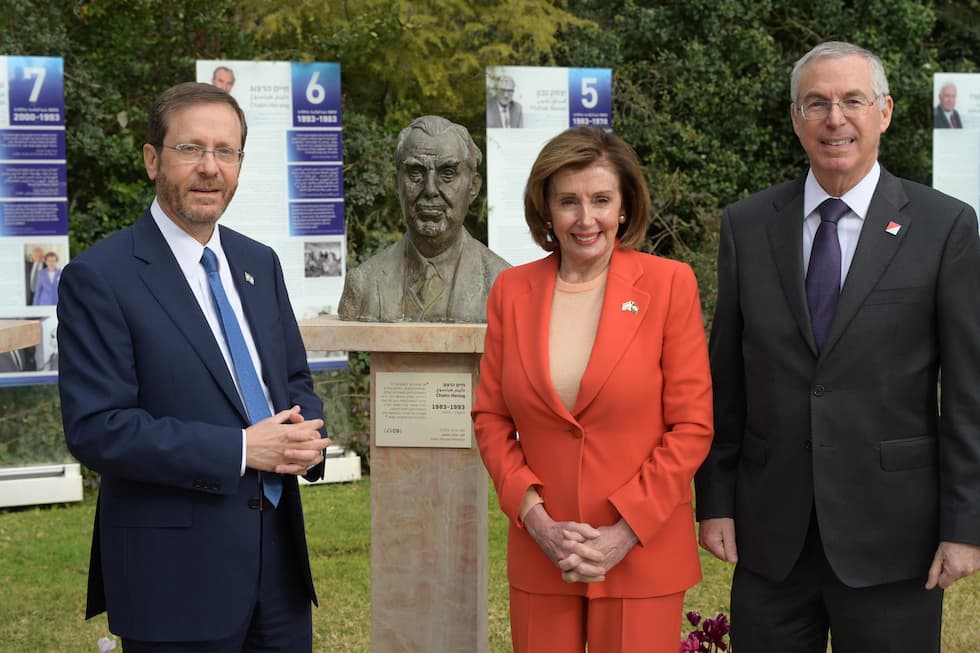 הנשיא יצחק הרצוג אירח בבית הנשיא אמש את ננסי פלוסי, יו"ר בית הנבחרים של ארצות הברית המבקרת בישראל. הפגישה התקיימה בהשתתפות שגריר ישראל בארצות הברית מיכאל (מייק) הרצוג, שגריר ארצות הברית בישראל תומס ריצ׳רד ניידס, וכן משלחת של שבעה חברי קונגרס: יושב ראש ועדת המודיעין של בית הנבחרים אדם שיף; יושב ראש תת הועדה לענייני המזרח התיכון, צפון אפריקה ולוחמה בטרור טד דויטש; חברת הקונגרס ברברה לי; חבר הקונגרס ביל קיטינג; חבר הקונגרס אריק סוואלוול; חבר הקונגרס רו קאנה; וחבר הקונגרס אנדי קים.