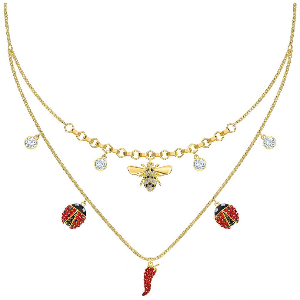 דבורה בשילוב אבני סברובסקי בצבעוניות של זהב צהוב, שחור ולבן, על השרשרת הארוכה תליון צ’ילי במרכז ותליוני חיפושית משה רבנו בצדדים למראה סימטרי מלא באור ובנשיות.