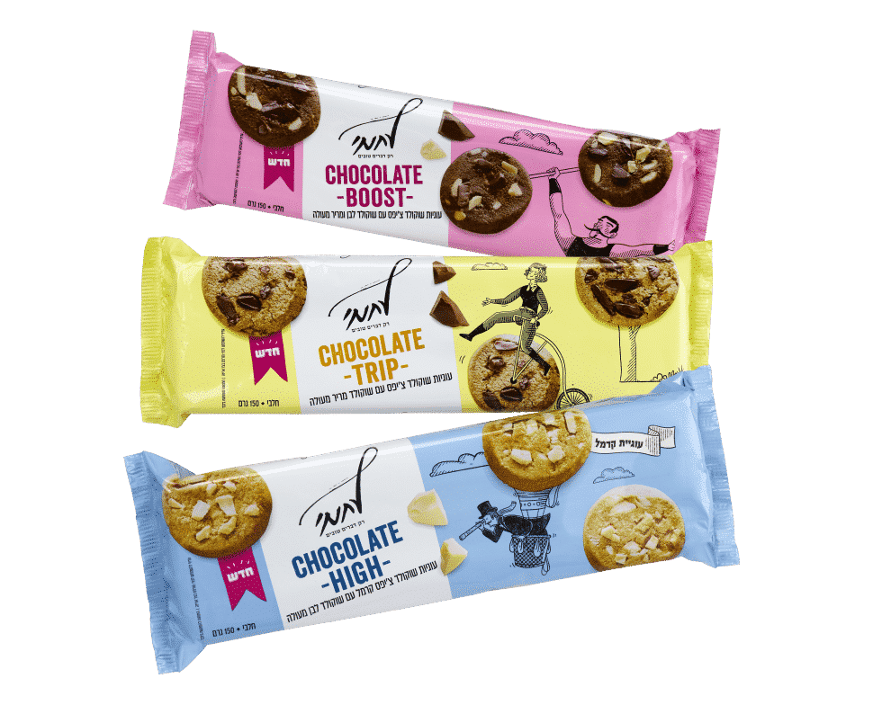 לחמי משיקה סדרת עוגיות שוקולד צ'יפס באיכות מעולה. הסדרה כוללת שלושה מוצרים של 150 גרם: עוגיות שוקולד צ'יפס עם שוקולד מריר מעולה, עוגיות שוקולד צ'יפס עם שוקולד לבן ומריר מעולה ועוגיות שוקולד צ'יפס קרמל עם שוקולד לבן.