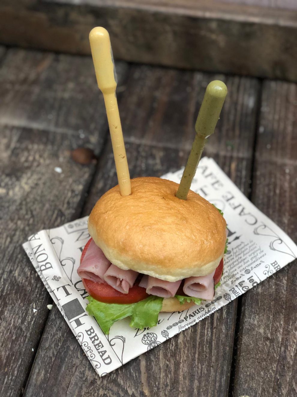 - פורסים את הסופגניות. מניחים פרוסות ירקות על חלקה התחתון של הסופגנייה, מגלגלים 3-4 פרוסות פסטרמה, מניחים אותן על הירקות וסוגרים עם חלקה השני של הסופגנייה.