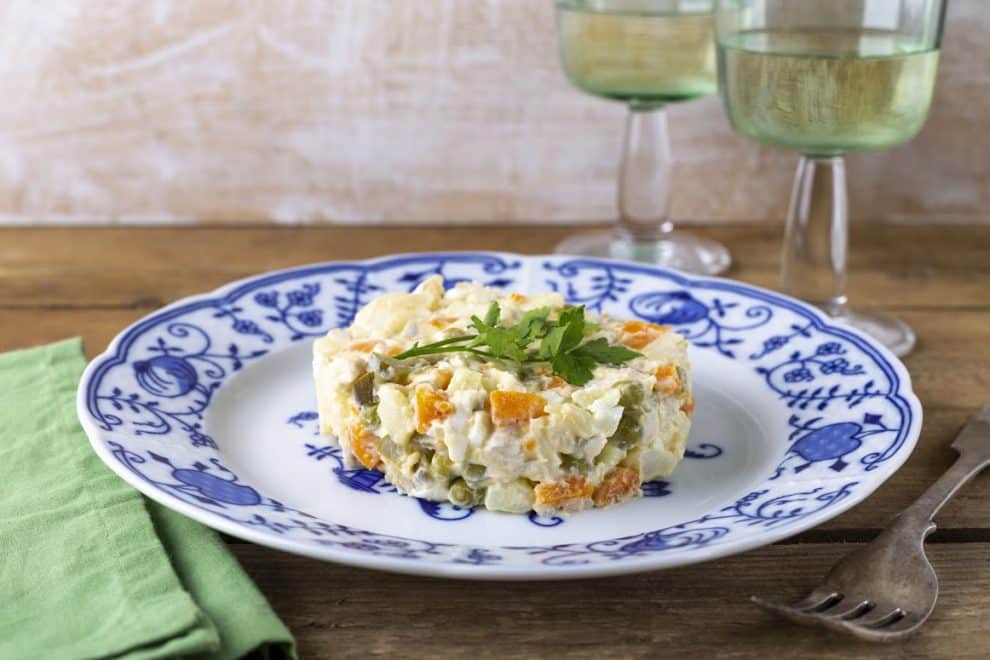 - מעבירים את כל המרכיבים החתוכים לקערה גדולה, מוסיפים את המלח והפלפל והמיונז ומערבבים היטב. טועמים ומתקנים את התיבול.