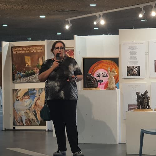 כאמור, בתערוכה משתתפים אומנים ואומניות מכל המדיות, כולל כאלה שהוציאו לאור ספרים חדשים בימים אלו: המשוררת, הסופרת והאומנית מיכל פרי שהוציאה לאור את ספרה “מרחב זמן שאבד”; המשורר והסופר יהורם גלילי שהוציא מהדורה שלישית ומעודכנת לספרו “פוטו מלחמה” (הוצאת ארגמן מיטב) שבחלק משיריו מתייחס לשבעה באוקטובר ולמה שהתרחש לאחר מכן; הפסיכולוגית והסופרת נטע ענבר סבן שבימים אלו מוציאה לאור את ספרה “נשבר לי הלב, תעזרו לי – טיפול פסיכולוגי בילדים ובנוער” (גלילי הוצאה לאור) מציגה טקסט ספרותי על הפסיפס של הקולות שבגינתה; ד”ר אסתר קפאח שהוציאה לאור את ספרה “מטוטלת” (הוצאת סטימצקי); ציפי שחרור שהוציאה לאור את ספרה “משוררת” (בית-עקד ספרים), האומנית רונית נוביק שהציגה תערוכת יחיד בבית ציוני אמריקה; האומנית, המשוררת והסופרת גליה שכטר שספרה “נמר פרא בברצלונה” (ספרי ניב) נולד מתוך התמודדות אישית שלה עם עולם שבו התמימות נסדקה; המשוררת והסופרת ד”ר רחלי אברהם איתן שלאחרונה הוציאה לאור את ספרה “כמעט בית” (שבילי אור ועמדה) שמציגה משיריה בחיבור לדימוי ויזואלי; האומנית והמשוררת אודליה יהודיין מציגה ציורים עם כתב; האומנית והסופרת ורד גרנדיר פרוכטמן שמציגה ציורי נשים צבעוניות המתייחסים ל-7.10.23; יולי פורטוגלי קושניר שמציגה פרויקט אומנותי ייחודי בשם “דמנציה יקירתי” שהחל עם מות האם ונמשך שלוש שנים; אורית ירון מציגה פסלים כחלק מריפוי והתמודדות עם סרטן השד שעברה דמויות של נשים שלדבריה הן חלק מהקסם של הפיסול ואמנים נוספים.