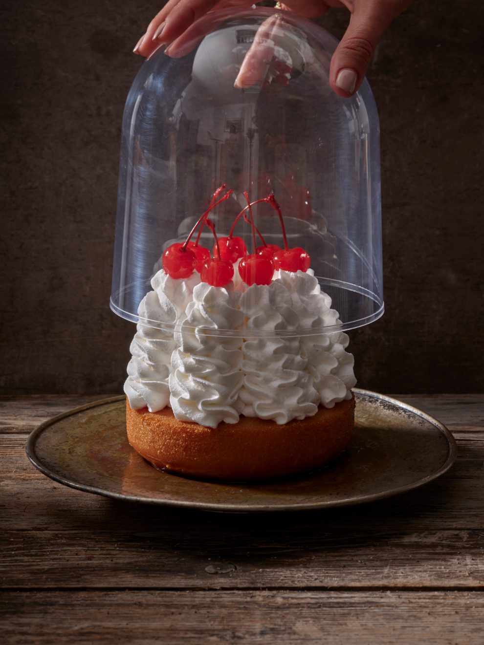 יש להקציף את כל החומרים עד קבלת קצפת יציבה. יש להניח את הסברינה על צלחת, להעביר את הקצפת לשק זילוף עם צנתר משונן, לזלף רוזטות מעל הסברינות ולמעלה להניח דובדבן.