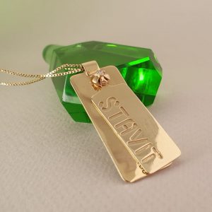 אלה לא סתם תכשיטים, זהו עומק, זו שירה, זהו רפרנס לעולם שלם שהיה ונעלם. העולם של הורי הורי. כשפגשתי בעבודות של אייל לא יכולתי שלא להביט דקות ארוכות בהתבוננות של גבר, עם אינסטינקט סקרן של ילד, בפלאק מוזהב שנראה במבט ראשון כמשהו שמתכתב עם הדיסקית האישית מימי הצבא, אבל עשוי ממלבן מעוצב ומוזהב ונושא את שמה של עונדת התכשיט על צווארה.