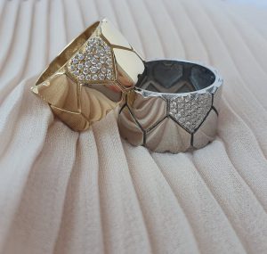 מנגד, זוג טבעות שנראות כמו אלמנט מיאנדר – כמו אבני מרצפת משולבות היטב, ומזכירים קרקע לאחר רעידת אדמה, עם קווים מבוקעים, ברורים ודרמטיים, ועם גימור ועיצוב במה שסתוית מכנה בתבונה והתבוננות – מורפולוגיה נשית, והכל בניחוח אותן כוכבניות קולנוע מימי תור הזהב של אולפני MGM.