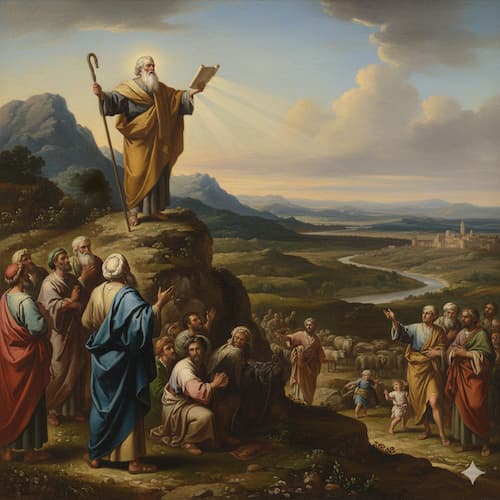 לאחר מכן הקב”ה ביקש ממשה לעלות על הר נבו כדי שיוכל לראות את ארץ כנען שהוא נותן להם: “עֲלֵה אֶל־הַר הָעֲבָרִים הַזֶּה הַר־נְבוֹ אֲשֶׁר בְּאֶרֶץ מוֹאָב אֲשֶׁר עַל־פְּנֵי יְרֵחוֹ וּרְאֵה אֶת־אֶרֶץ כְּנַעַן אֲשֶׁר אֲנִי נֹתֵן לִבְנֵי יִשְׂרָאֵל לַאֲחֻזָּה׃” ואז משה יפטר מן העולם במיטת נשיקה כמו אהרון אחיו ולא יכנס לארץ: “וּמֻת בָּהָר אֲשֶׁר אַתָּה עֹלֶה שָׁמָּה וְהֵאָסֵף אֶל־עַמֶּיךָ כַּאֲשֶׁר־מֵת אַהֲרֹן אָחִיךָ בְּהֹר הָהָר וַיֵּאָסֶף אֶל־עַמָּיו׃,“ מאחר שמשה לא קידש את שם הקב”ה במי מריבה: “עַל אֲשֶׁר מְעַלְתֶּם בִּי בְּתוֹךְ בְּנֵי יִשְׂרָאֵל בְּמֵי־מְרִיבַת קָדֵשׁ מִדְבַּר־צִן עַל אֲשֶׁר לֹא־קִדַּשְׁתֶּם אוֹתִי בְּתוֹךְ בְּנֵי יִשְׂרָאֵל׃ כִּי מִנֶּגֶד תִּרְאֶה אֶת־הָאָרֶץ וְשָׁמָּה לֹא תָבוֹא אֶל־הָאָרֶץ אֲשֶׁר־אֲנִי נֹתֵן לִבְנֵי יִשְׂרָאֵל׃“.