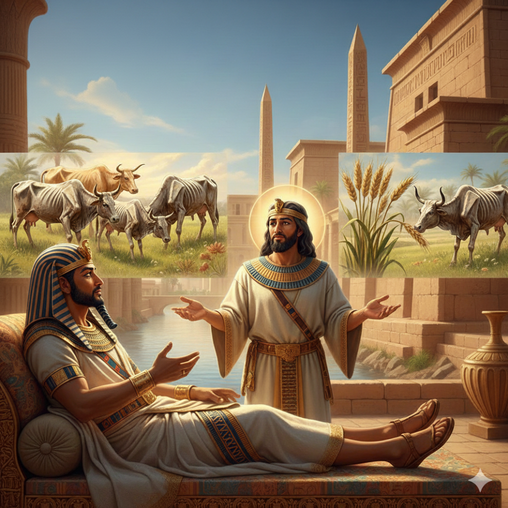 יוסף ניצב לפני פרעה שמספר לו על כך שחלם חלום ואין מי שיפתור אותו, והוא שמע שיוסף יודע לפתור חלומות: “וַיֹּאמֶר פַּרְעֹה אֶל־יוֹסֵף חֲלוֹם חָלַמְתִּי וּפֹתֵר אֵין אֹתוֹ וַאֲנִי שָׁמַעְתִּי עָלֶיךָ לֵאמֹר תִּשְׁמַע חֲלוֹם לִפְתֹּר אֹתוֹ׃”. יוסף מצטנע ומשיב שהחכמה היא של הקב”ה: “וַיַּעַן יוֹסֵף אֶת־פַּרְעֹה לֵאמֹר בִּלְעָדָי אֱלֹהִים יַעֲנֶה אֶת־שְׁלוֹם פַּרְעֹה׃”. פרעה מספר ליוסף את חלומותיו, ויוסף משיב לו שמדובר בחלום אחד שבו הקב”ה מתריע לפניו על העתיד להתרחש: “וַיֹּאמֶר יוֹסֵף אֶל־פַּרְעֹה חֲלוֹם פַּרְעֹה אֶחָד הוּא אֵת אֲשֶׁר הָאֱלֹהִים עֹשֶׂה הִגִּיד לְפַרְעֹה׃” בעזרת השם, יוסף פותר את החלום לפרעה באופן הבא: