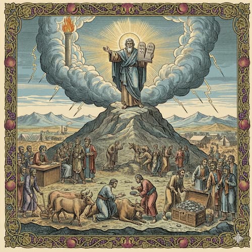 משה על להר סיני עם אהרון, נדב ואביהוא. שבעים הזקנים השתחוו מרחוק. משה התקדם לבדו אל הערפל. כשירד אל העם וסיפר להם את כל דברי ה’ הם קיבלו פה אחד: “וַיָּבֹא מֹשֶׁה וַיְסַפֵּר לָעָם אֵת כָּל־דִּבְרֵי יְהוָה וְאֵת כָּל־הַמִּשְׁפָּטִים וַיַּעַן כָּל־הָעָם קוֹל אֶחָד וַיֹּאמְרוּ כָּל־הַדְּבָרִים אֲשֶׁר־דִּבֶּר יְהוָה נַעֲשֶׂה׃”.
