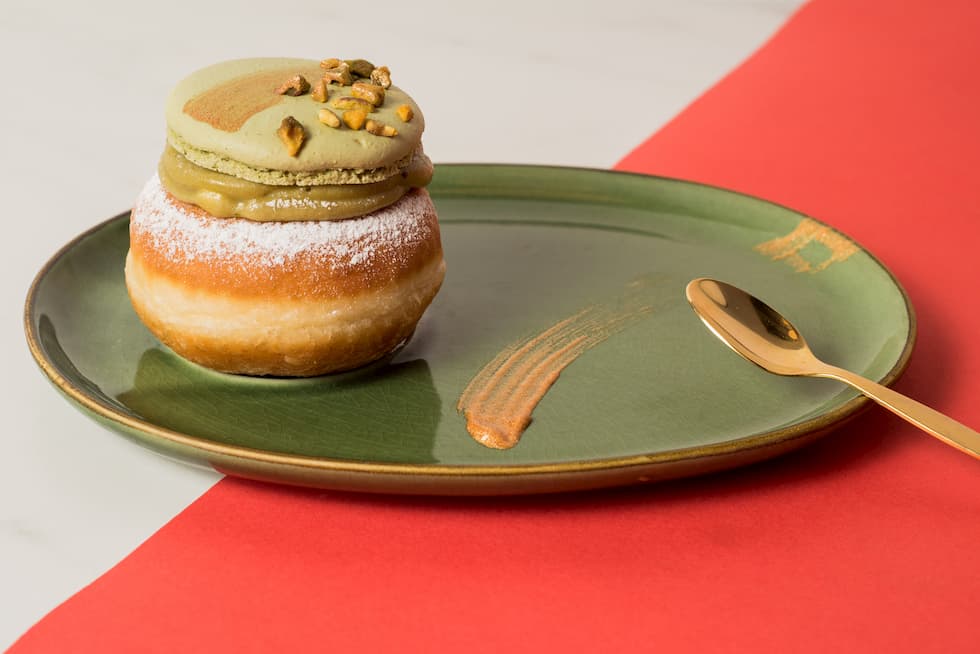 מקרון פיסטוק – סופגנייה במילוי קרם פיסטוק בקישוט מקרון ירקרק (13 שקלים)