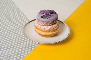 מקרון פירות יער – סופגנייה במילוי קרם פירות יער בקישוט מקרון סגול (13 שקלים)