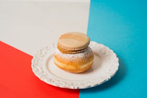 מקרון אלפחורס – סופגנייה במילוי קרם ריבת חלב מעודן בקישוט מקרון עם קוקוס (10 שקלים)