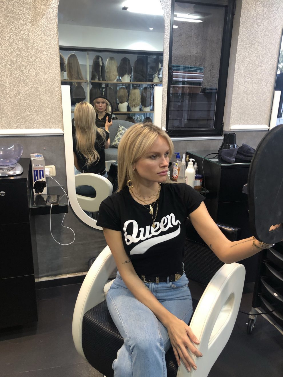 ללוק הדוגמנית המטופח תוך שהיא מרעננת את השיער עם תוספות ונפח במרכז “דורון פסקינו” ברמת גן.