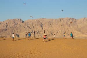 - חווית העפת עפיפונים בדיונות סמר מול הרי אדום עם צוות ההדרכה של קיבוץ אליפז.