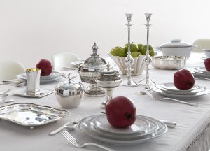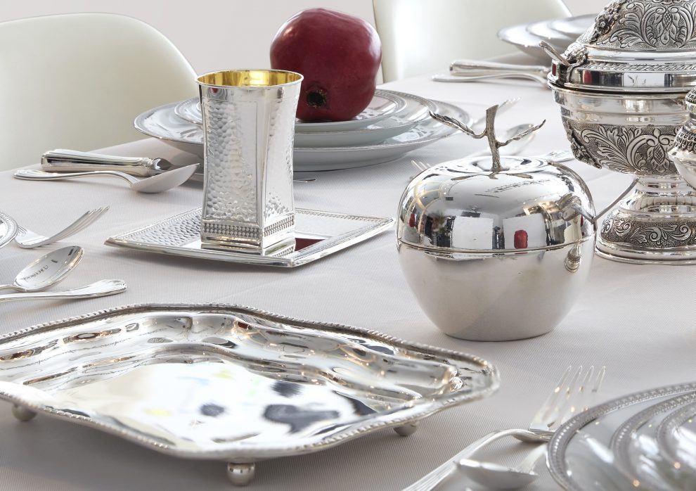 כלי כסף הוא פריט נצחי ורבים מתחילים ללקט ולהרחיב את קולקציית כלי הכסף שלהם מרגע החתונה בו הם מקבלים כמתנה זוג פמוטים או סט קידוש עם חריטה. השילוב הנכון הוא לבחור בסרוויס צחור שלא יגנוב את ההצגה ולתכשט את השולחן עם כלי כסף טהור המסמלים את חגי תשרי ומוסיפים נופך מרשים ומהודק: דבשיות בצורת תפוח מרשים, כלי הגשה רקועים, פמוטים, גביע קידוש עם תבליטים מסורתיים, דג כאלמנט דקורטיבי “שנהיה לראש ולא לזנב”, מלחייה ופלפלייה מרשימים, קופסת אתרוג ועוד.