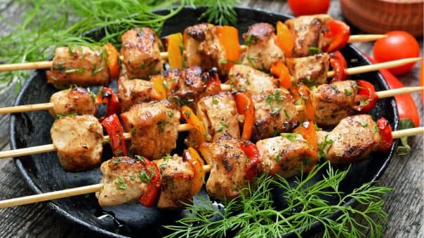 מחממים את השמן במחבת כבדה על אש גבוהה, מניחים את השיפודים במחבת הלוהטת וצולים אותם 3-4 דקות מכל צד.  מתבלים במלח ופלפל.  מוסיפים למחבת את העגבניות והאת התבלינים .  מבשלים כ- 10 דקות נוספות על אש בינונית.  מדי פעם בפעם הופכים את השיפודים.