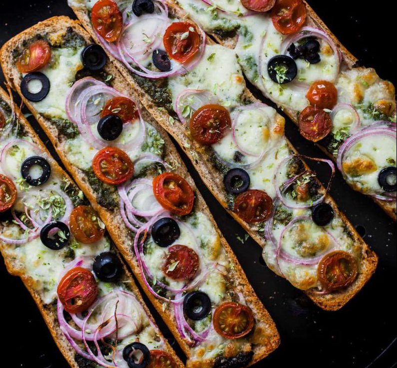 חוצים באגט, מורחים כל חצי בפסטו ומקשטים בשאר המרכיבים חתוכים לפרוסות.