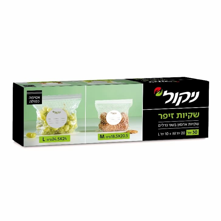 שקיות הזיפר של ניקול מגיעות בשני גדלים באריזה אחת! השקיות בעלות אטימה כפולה על-ידי פס סגירה כפול לאטימה מלאה ולמניעת נזילות. להשיג ברשתות השיווק.