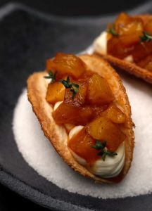 - מצננים מעט את קונכיות הטורטיות כדי לשמור על צורתן. הופכים אותן וממלאים בגבינת מסקרפונה טבעונית שמעורבבת עם יוגורט יווני טבעוני. מלמעלה מניחים מתערובת התפוחים. מקשטים בעלי בעלי תימין, ומגישים.