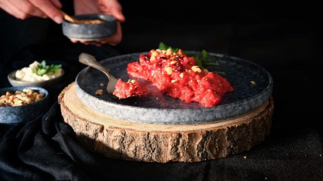 ארוחה קיצית בניחוח ים תיכוני של ריזוטו סלק, גבינות, יין לבן ואגוזים, פשטידת פטריות ותרד המזכירה את הספנקופיטה היוונית. ולקינוח: סורבה תות בננה טבעוני...