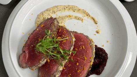רוסטביף צרפתי במעטפת חרדל דיז’ון על מצע קרם בטטה שורש פטרוזיליה וקרם קוקוס בזיגוג טריאקי. מצרכים ל 4 אנשים. 1 נתח סינטה אירופי טרי, נקי משומן...