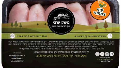 מותג העוף הטבעי 'משק ארצי'משיק העוף צמחוני היחיד המציע לצרכנים עוף הניזון מתזונה צמחונית בלבד, ללא אנטיביוטיקה והורמונים. עם המדבקה הכתומה .