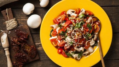 מצרכים: סלסלת עגבניות שרי, עדיף מזן תמר סלסלת פטריות שמפניון 15 עלי בזיליקום 8 עגבניות מיובשות 1/2 בצל סגול 10 ענפי עירית או 5 ענפי בצל ירוק או צרור...