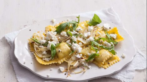 מתכון מפנק – רביולי עם שומר צלוי, גבינת עיזים וארוגולה טעמי האניס של השומר, המרירות העדינה של הארוגולה הטרייה והמתקתקות המעודנת של הרביולי ושל גבינת...