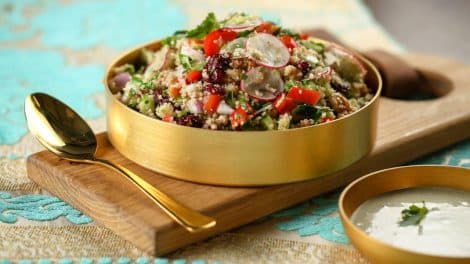 מנה נפלאה ומזינה של סלט טאבולה רענן וטעים, עם קוסקוס מלא ובתיבול של טחינה.עם השפית ג'קי אזולאי סלט עשיר בטעמים שיכול לשמש כארוחה עיקרית או כתוספת...