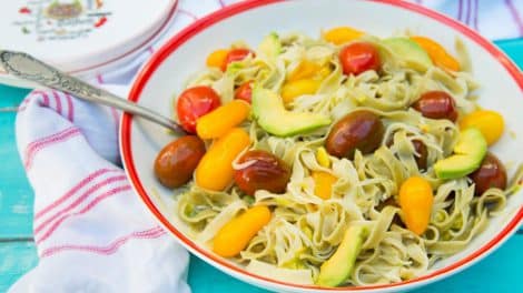 מתכון למנה יפיפייה וטעימה: פסטה עם אבוקדו! פסטה פטוצ'יני עם עגבניות שרי ופרוסות אבוקדו, תענוג לחיך. המנה טבעונית ויכולה להתאים כסלט, כתוספת וכמנה...