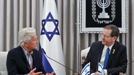נשיא המדינה יצחק הרצוג ורעייתו מיכל אירחו היום, יום ראשון, כ״ה באייר, 2 ביוני, את השחקן ההוליוודי מייקל דאגלס שהגיע לביקור סולידריות בישראל.