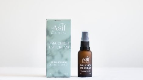 מותג הקוסמטיקה הטבעי אסיף קוסמטיקס מיוצר כחול לבן , משיק קרם עיניים מסדרת באקוצ'יול וסרום ויטמינים מבוסס חומצה היאלרונית משולשת.