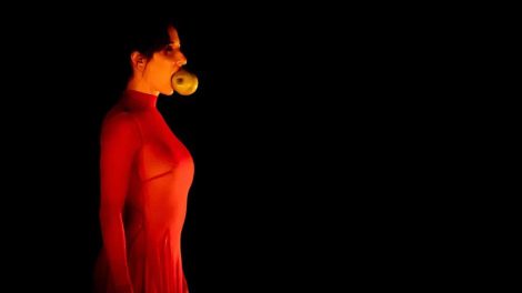 אישה בשמלה אדומה, תפוח בפיה. קול מתחקה אחר שאלות שכמעט שכחנו לשאול, אלה שנראות לא רלוונטיות, שהזמן המאיץ מחק מהיומיום שלנו. מתי הפסקנו לעצור, לנשום...