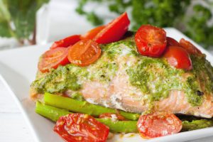 מרכיבים: דג סלמון פרוס (200 גרם) 1-2 שיני שום 1/4 כוס מיץ לימון טרי עלי בזיליקום טריים 1 כפית שמן זית חצאי עגבניות שרי מלח, פלפל אופן הכנה: הכנת הרוטב –...