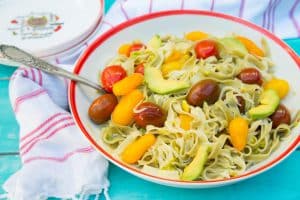 מתכון למנה יפיפייה וטעימה: פסטה עם אבוקדו! פסטה פטוצ'יני עם עגבניות שרי ופרוסות אבוקדו, תענוג לחיך. המנה טבעונית ויכולה להתאים כסלט, כתוספת וכמנה עיקרית בחג...