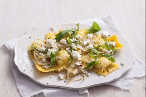 מתכון מפנק – רביולי עם שומר צלוי, גבינת עיזים וארוגולה טעמי האניס של השומר, המרירות העדינה של הארוגולה הטרייה והמתקתקות המעודנת של הרביולי ושל גבינת העיזים...
